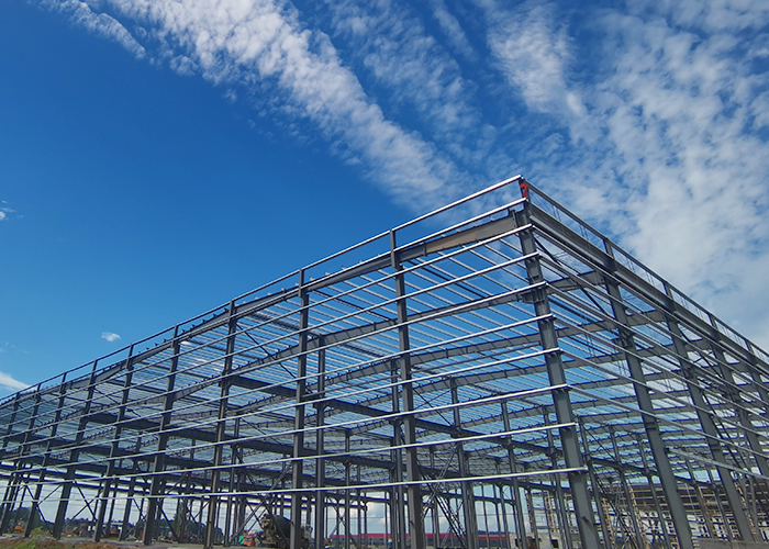 Portal steel structures are generally installed by hoisting. The installation sequence starts with the axis rigid frame with column bracings: first assemble the roof beam on the ground, then install the column, hoist the roof beam to splice and position with the column, and set temporary supports. After two rigid frames are in place, install supporting components such as bracings, purlins, and knee brace, and check verticality. The lifting points of large components should be checked to ensure no permanent deformation.
